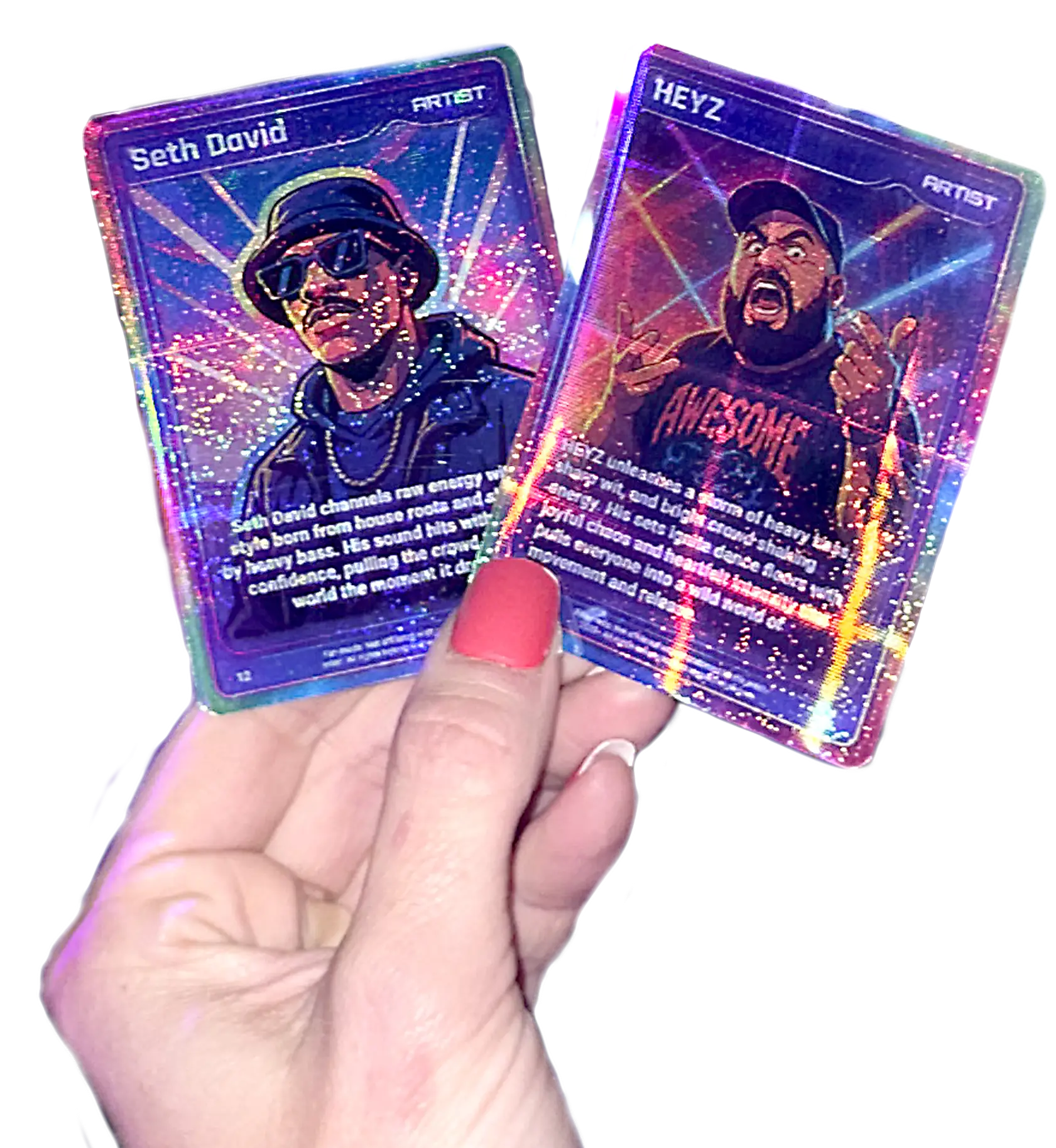 Festival inspired EDM trading cards made for ravers who collect, trade, and chase the vibe